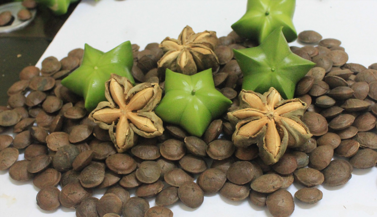在丰收之际,家家户户都会唱着山歌去采收,采收回的美藤果不能吃,需要通过加工处理才能食用,于是陈军将回收来的美藤果果仁压榨成油,平均10毫升就价值50元。
