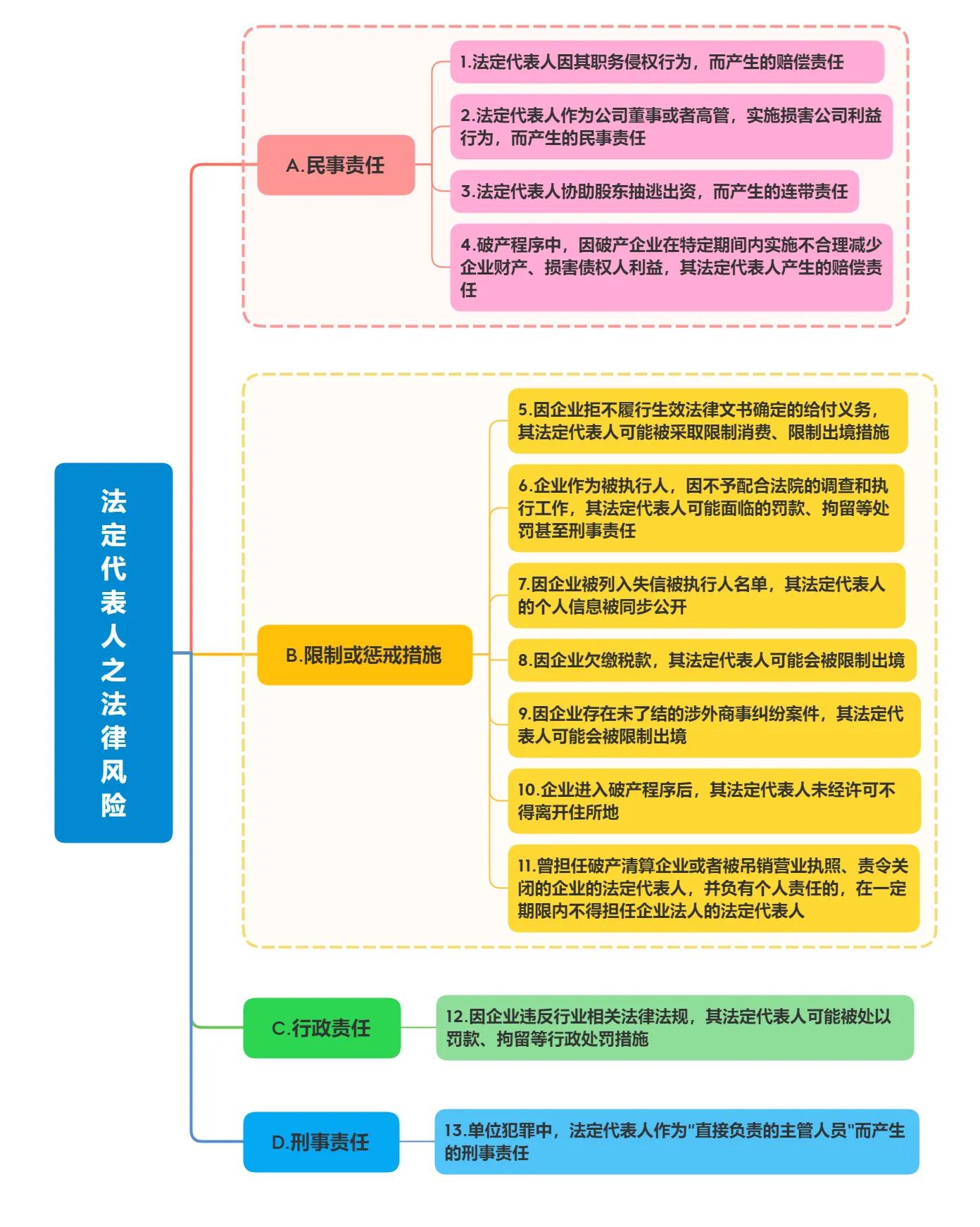 法律规定浩如烟海,对法律的理解也存在差异。本文仅为笔者结合自身经验,并在法律检索的基础上,对法定代表人存在的13类法律风险或者法律责任进行概括总结。在法律实务中,法定代表人在何种情形下是否需要承担法律责任、承担何种法律责任,需要结合具体情况及法律法规予以确定。