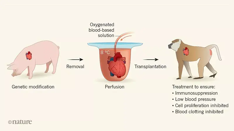 2018年12月,Nature发布了一项轰动整个器官移植界的研究,通过基因改造过的猪心脏,成功移植到了狒狒体内。