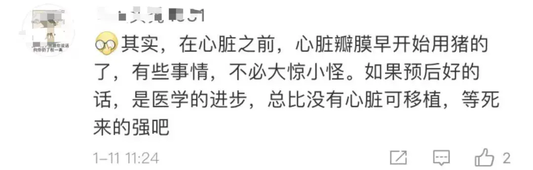 「其实,在心脏之前,心脏瓣膜早开始用猪的了。有些事情,不必大惊小怪。如果预后好的话,是医学的进步,总比没有心脏可移植,等死来的强吧。」
