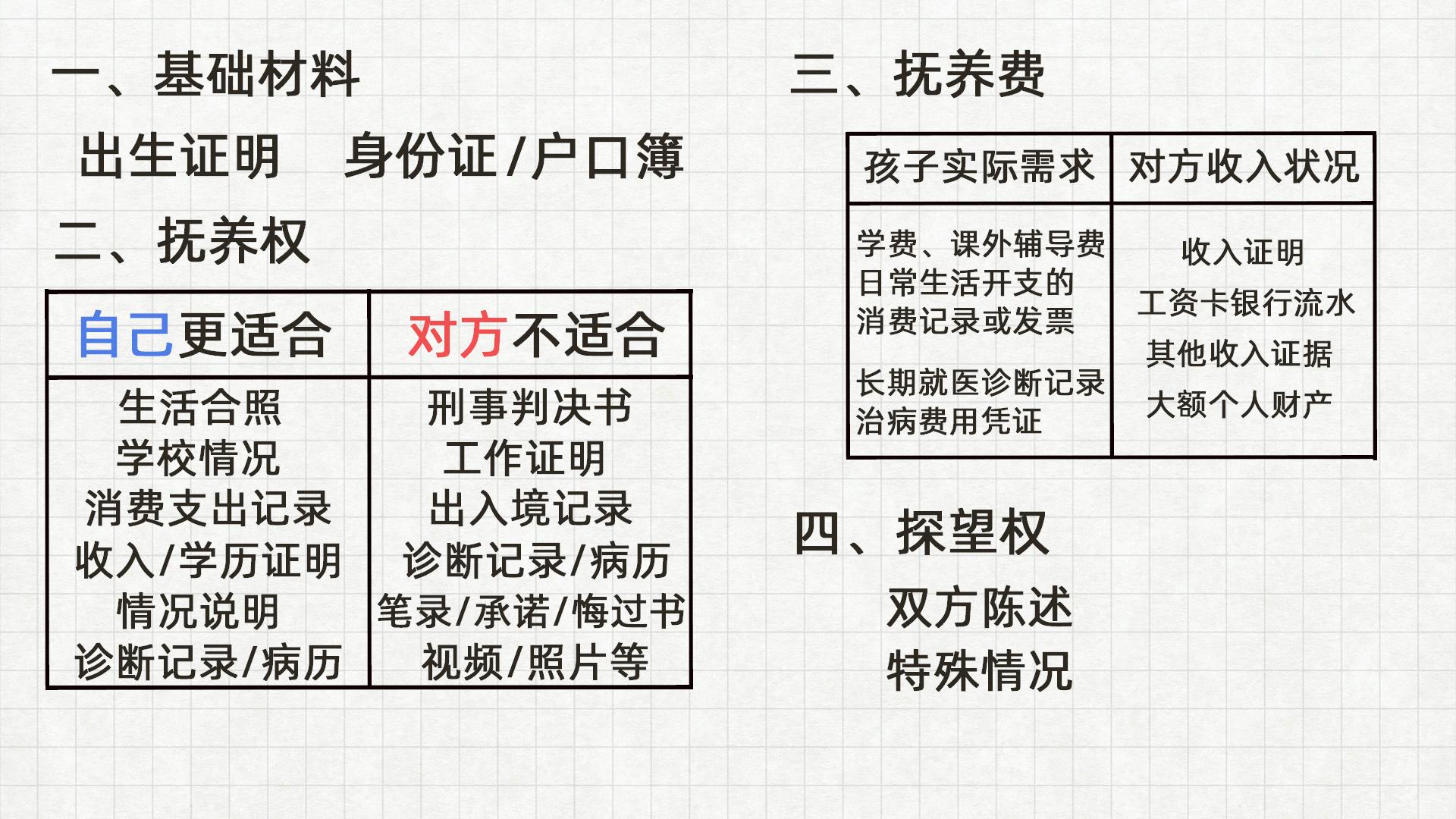 和孩子抚养权相关的证据材料可以分为基础信息、抚养权、抚养费、以及探望权四个部分。