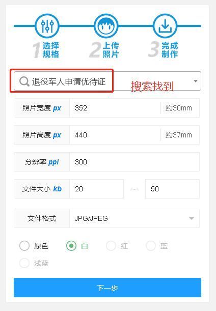 选择“证件照处理”功能,在照片规格中可以搜索找到【退役军人申请优待证】