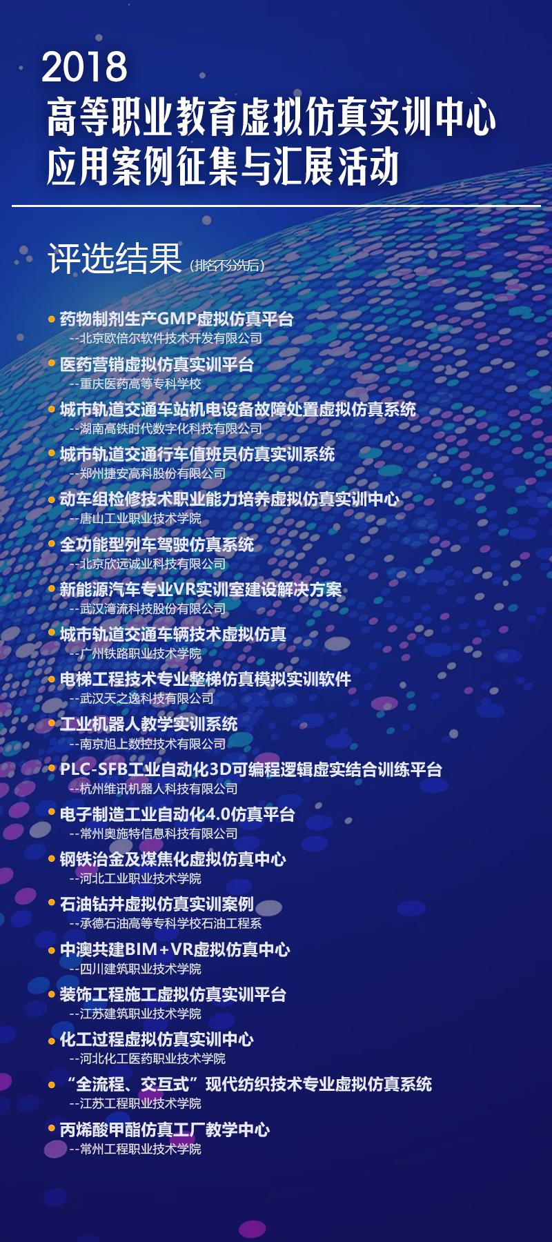 为了促进虚拟仿真与实训教学的有机结合,丰富教学资源库内容,由全国高职高专校长联席会议主办,中国职业技术教育学会职业教育装备专业委员会与高等教育出版社共同承办的"2018年高等职业教育虚拟仿真实训中心应用案例征集与汇展活动"。