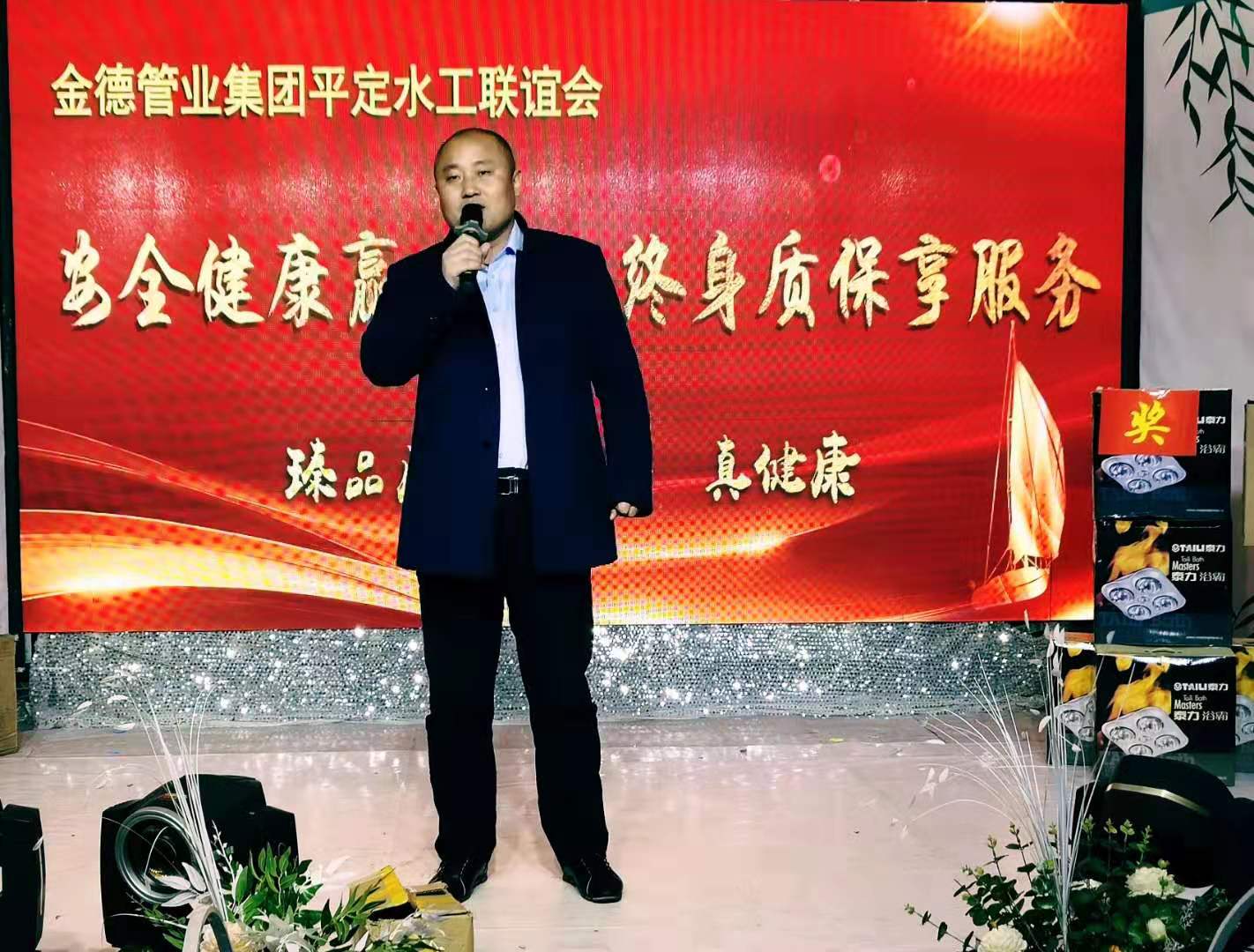 金德管业平定县总代理颜建蕊,贾奎英发言振奋人心 联谊会在贾总热情洋溢的新年贺词中拉开序幕,他说:“刚刚过去的一年,在全体同仁的共同努力下平定建蕊建材部业务保持了持续稳健的发展,并取得了良好的成绩,这些成绩是属于在座每一位金德水工技师的,金德的未来将更加辉煌”。