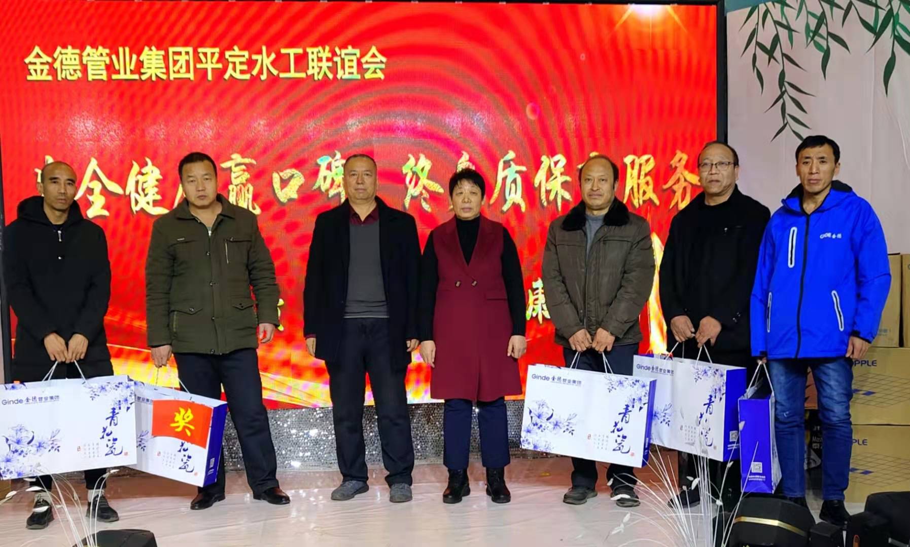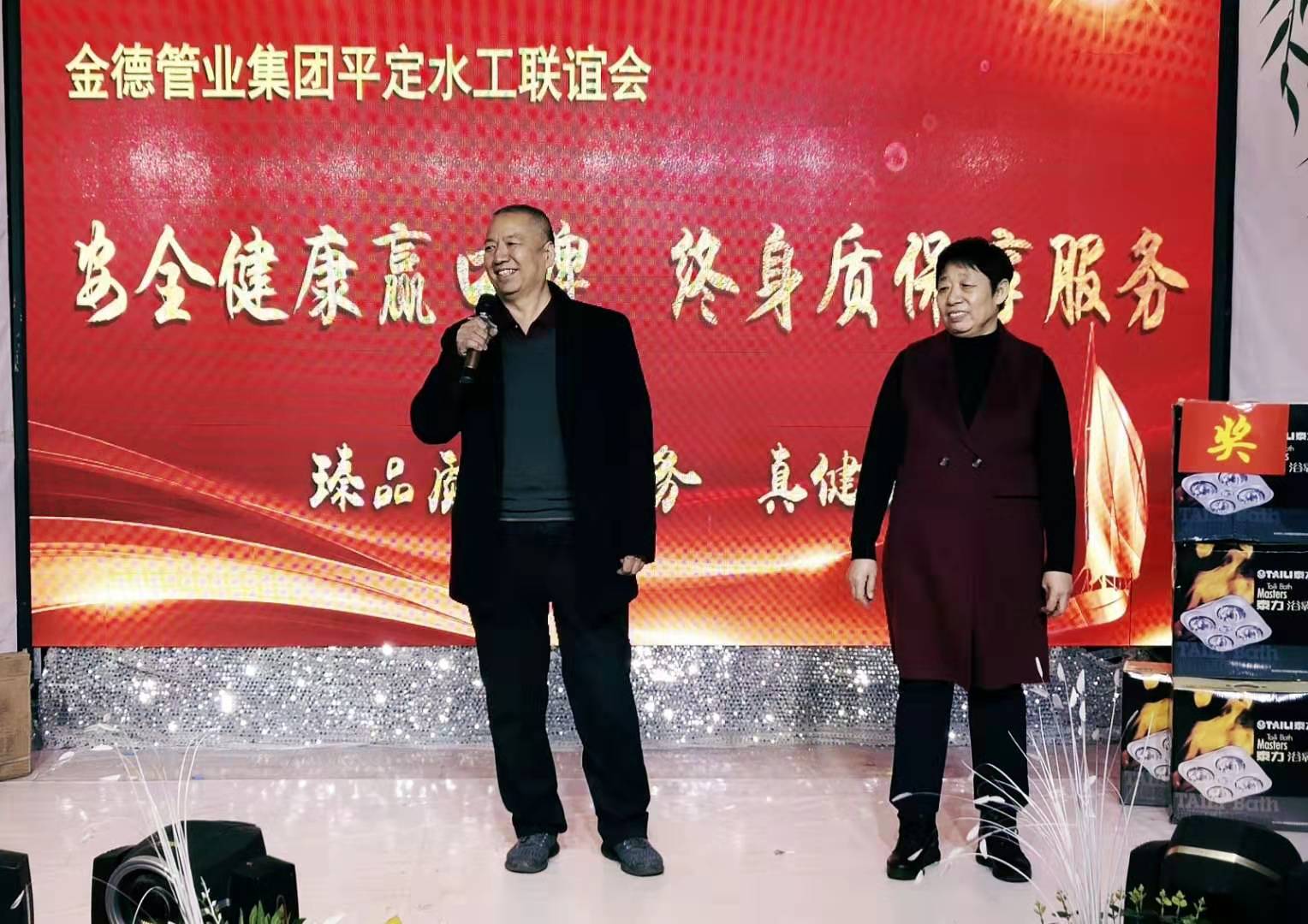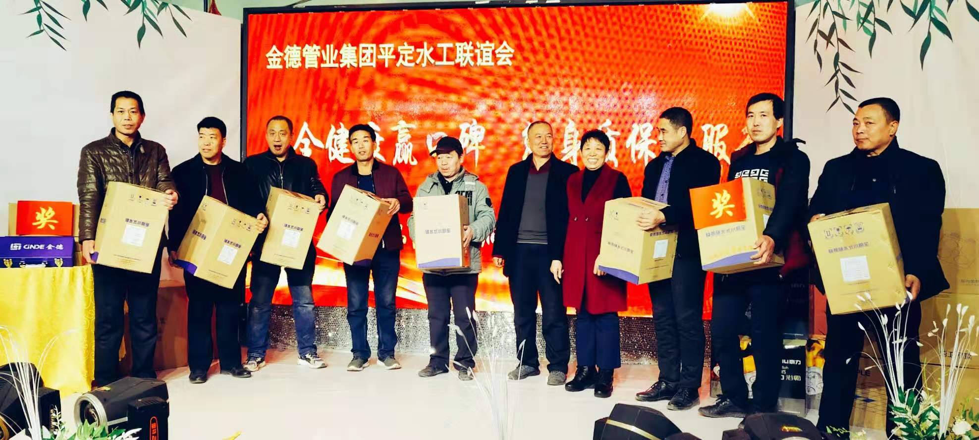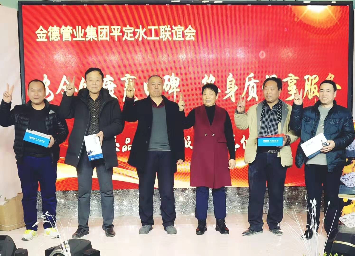 2020年1月2日金德管业集团平定县总代理建蕊建材部总结2019展望2020”水工技师联谊会在山海天大酒店一楼大厅隆重举行,金徳管业集团领导王东兴携金德管业阳泉市区域负责人段洪超,丁润冬及全体平定县金徳水工技师200余人欢聚一堂,共度联欢。