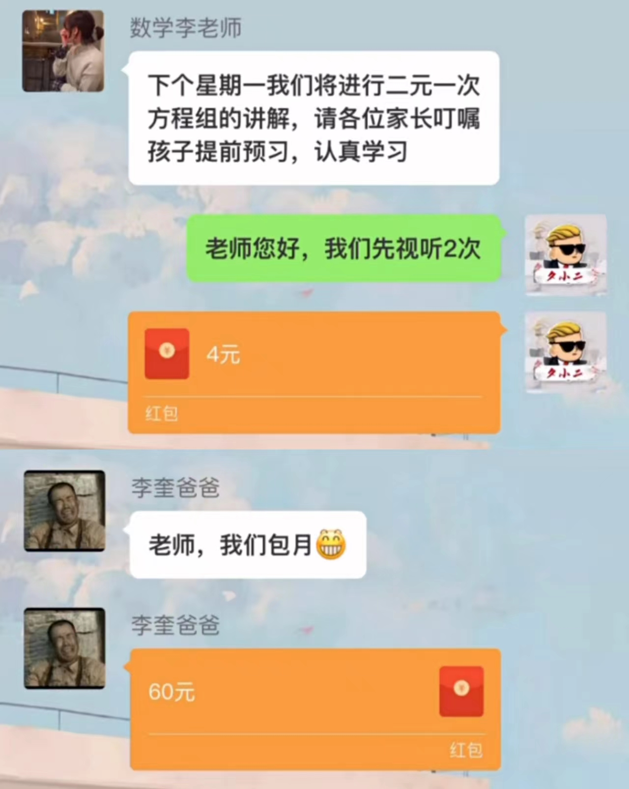 这位要试听“二元一次”方程的家长,难道不觉得太贵了吗?显然是“一元两次”方程更合适啊!下次可以不要上这种当了!包括下面那位包月的家长也是。
