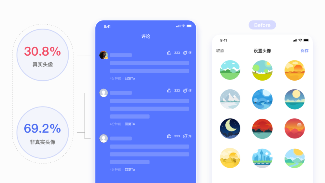 首先是问题定位,目前仅有30%的用户自定义真实头像,相较于竞品处于较低的状态。并且默认头像设计过时,氛围感不⾜,体验较差。
