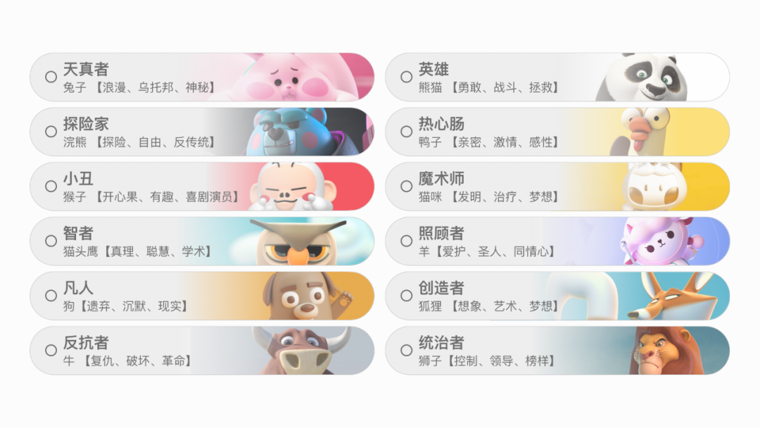 心理学家荣格定义了人类基础人格的12个主要类型。每种类型都有自己的价值观、意义和性格特点,从性格中提取关键词,分别筛选出有共性的、大众熟知度高的动物形象来匹配12种人格。