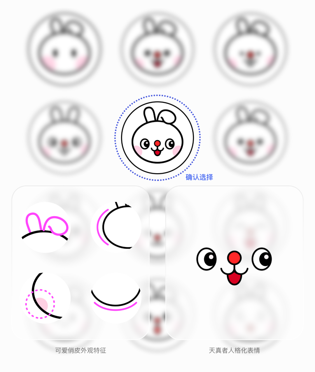 草图绘制确定动物形象基础造型与特征。以天真者为例,为了表现形象俏皮、可爱的特性,兔子一边耳朵折叠,并且选用圆润的外观,搭配脸上的腮红。通过表情大眼睛,张嘴微笑来表达心理人格。