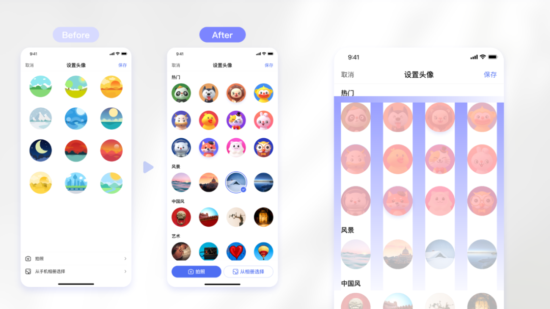 头像设置页面优化升级,提升页面容器屏效。将之前头像尺寸减小并缩小间距,保证有限屏幕内用户可以看到更多的头像。并将头像以分类形式显现,方便用户挑选符合自己喜好的头像样式。下方“拍照”和“从相册选择”入口样式更新,突出拍照入口。