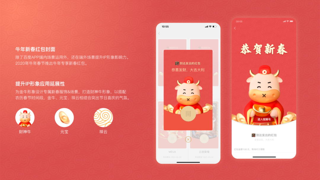 除了百度APP端内场景运用外,还在端外场景提升IP形象影响力。2021年牛年春节推出牛年专享新春红包。为金牛形象设计专属新春服饰&场景,打造财神牛形象,以搭配农历春节时间段,金牛、元宝、祥云相结合突出节日喜庆的气氛。