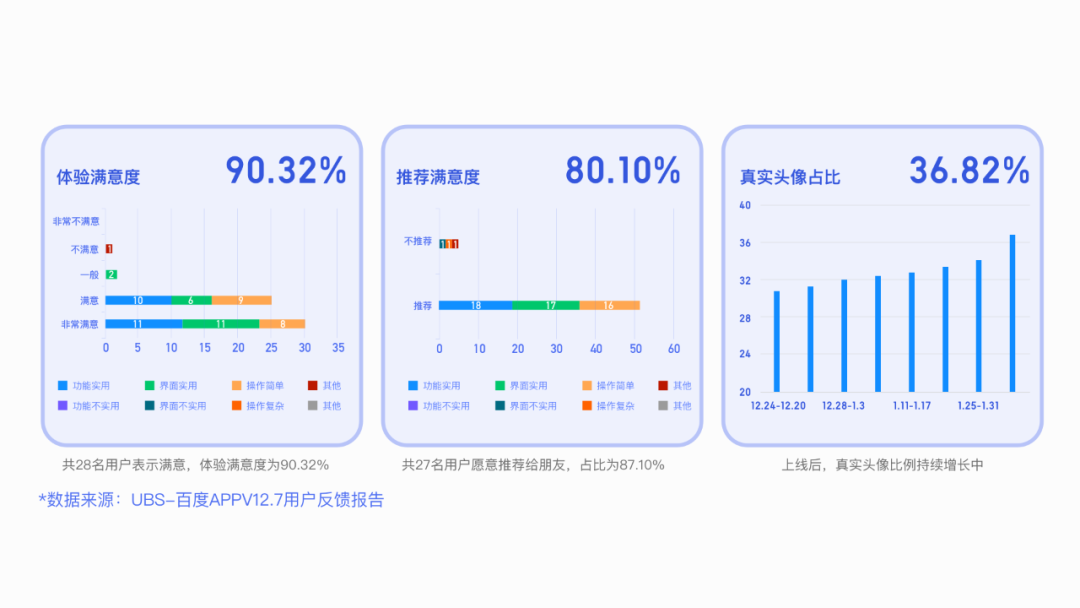 帐号人格化头像上线后得到了良好的反馈,用户满意度及推荐度远超预期,得到了近90%的用户反馈。同时通过相关的场景推荐综合提升了百度APP用户真实头像占比,并且数据还在持续提升中。