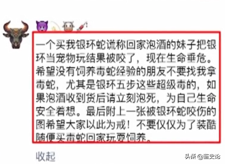 不过,虽然这个商家拒绝承认与玲玲之间存在毒蛇交易,但在他删除了玲玲的好友之后,却在朋友圈里发了一条声明,称“有个妹子把银环蛇当宠物玩结果被咬了,希望没有饲养毒蛇经验的朋友不要找我拿毒蛇。”