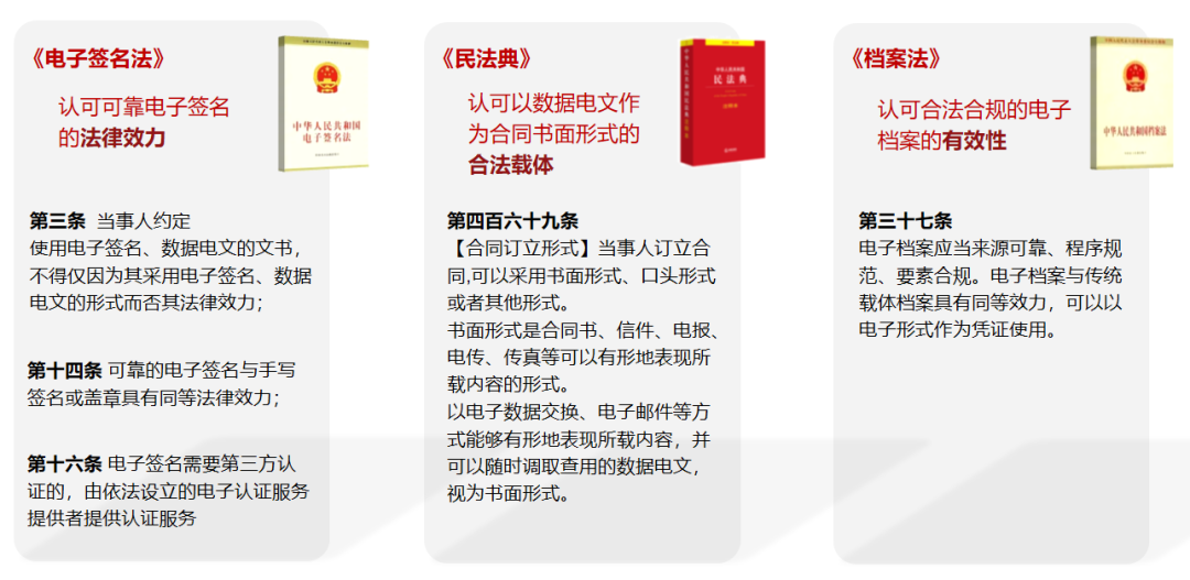 《电子签名法》认可可靠电子签名的合法效力,《合同法》认可数据电文作为合同书面形式的合法载体,《民事诉讼法》认可电子数据作为法定证据种类的合法地位。以上均从立法层面确立了电子签约应有的法律地位。