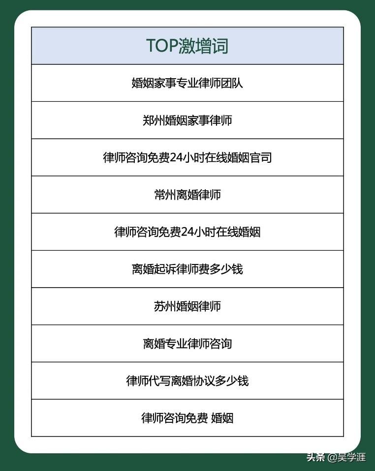 离婚诉讼激增词中同样地域词较多,“苏州”“常州”“郑州”为前缀,这些地方需求激增,肯定有外界因素刺激才能产生,对律师而言这就是一个商机。