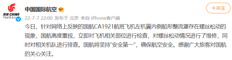 7日晚,@中国国际航空 做出回应:针对网络上反映的国航CA1921航班飞机左机翼内侧船形整流罩存在螺丝松动的现象,国航高度重视,立即对飞机相关部位进行检查,对螺丝松动情况进行了维修,同时对相关机队进行排查。国航将坚持“安全第一”,确保航空安全。感谢广大旅客对国航的关心关注。