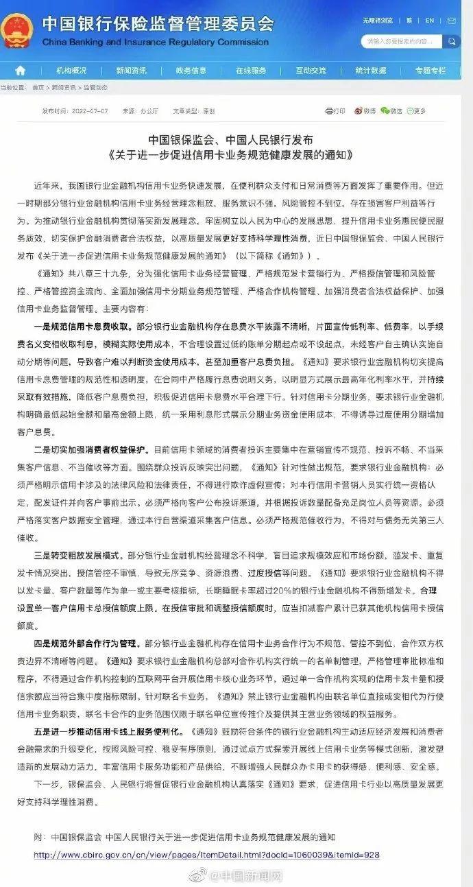 7月7日,中国银保监会、中国人民银行发布《关于进一步促进信用卡业务规范健康发展的通知》。通知明确,针对信用卡分期业务,要求银行业金融机构明确最低起始金额和最高金额上限,统一采用利息形式展示分期业务资金使用成本,不得诱导过度使用分期增加客户息费。《通知》要求,银行业金融机构不得以发卡量、客户数量等作为单一或主要考核指标,长期睡眠卡率超过20%的银行业金融机构不得新增发卡。