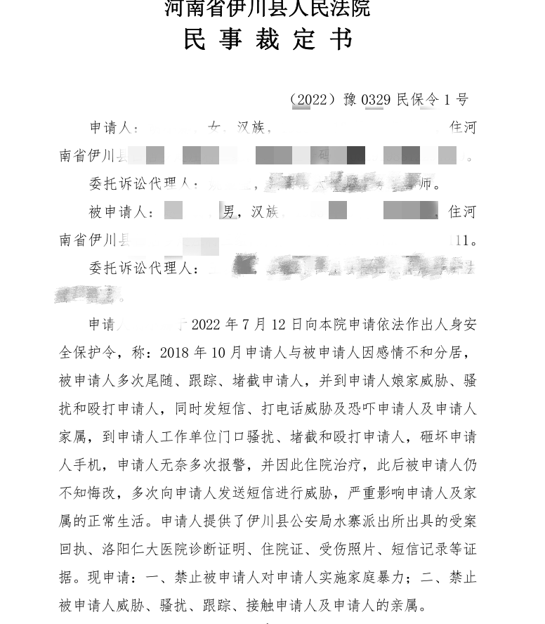 近日,伊川县法院江左法庭发出2022年首份人身安全保护令裁定书,对因受到家暴而申请离婚的妇女胡某及其亲属进行人身安全保护,对施暴者赵某某进行约谈,正告其按“人身安全保护令”履行法律义务。