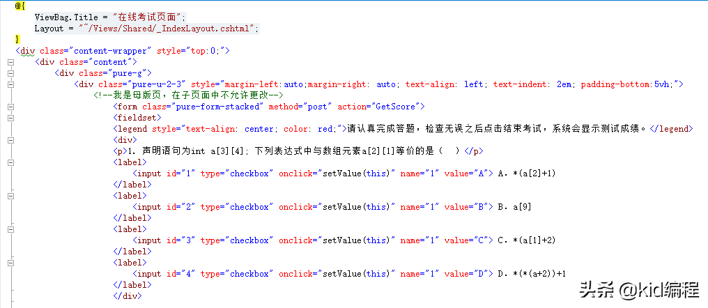 本例实现效果主要页面包括三个不同页面,因此需要基于模板定义三个不同视图。在业务逻辑操作完成之后可使用视图进行输出显示。三个视图分别为exam.cshtml考试页面、Index.cshtml首页视图、GetScore.cshtml结果页面。考试页面视图定义描述如下: