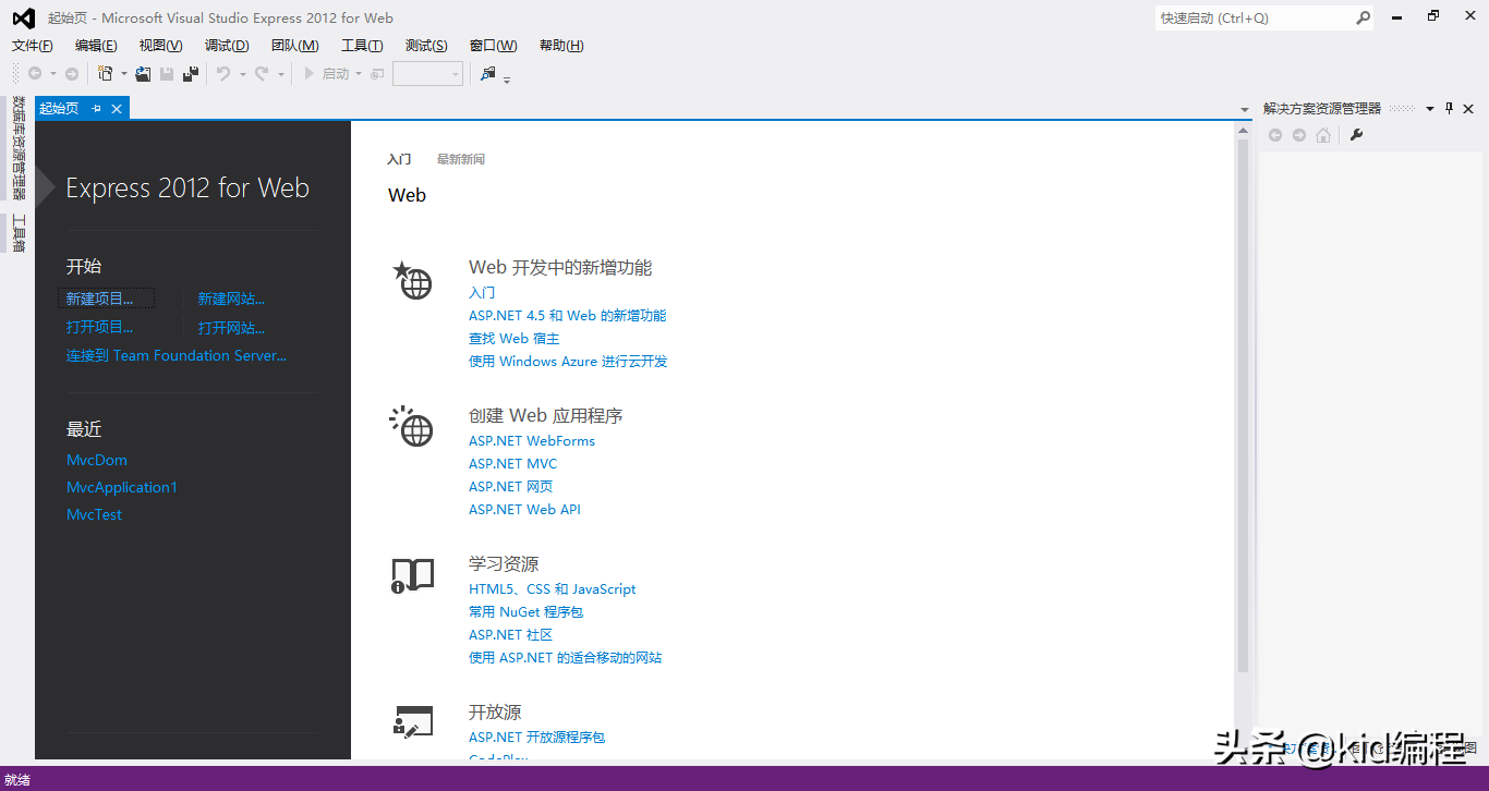 本文选择MVC实现编程语言为C#程序设计语言,所使用的的应用架构为.NET集成开发环境。因此开发工具选择使用了微软公司开发的Visual Studio集成开发工具与环境。Microsoft Visual Studio Express是Visual Studio的轻量级版本,在ASP.NET应用开发方面硬件需求较低。本例使用版本为Microsoft Visual Studio Express 2012版本,软件运行起始页如下图所示: