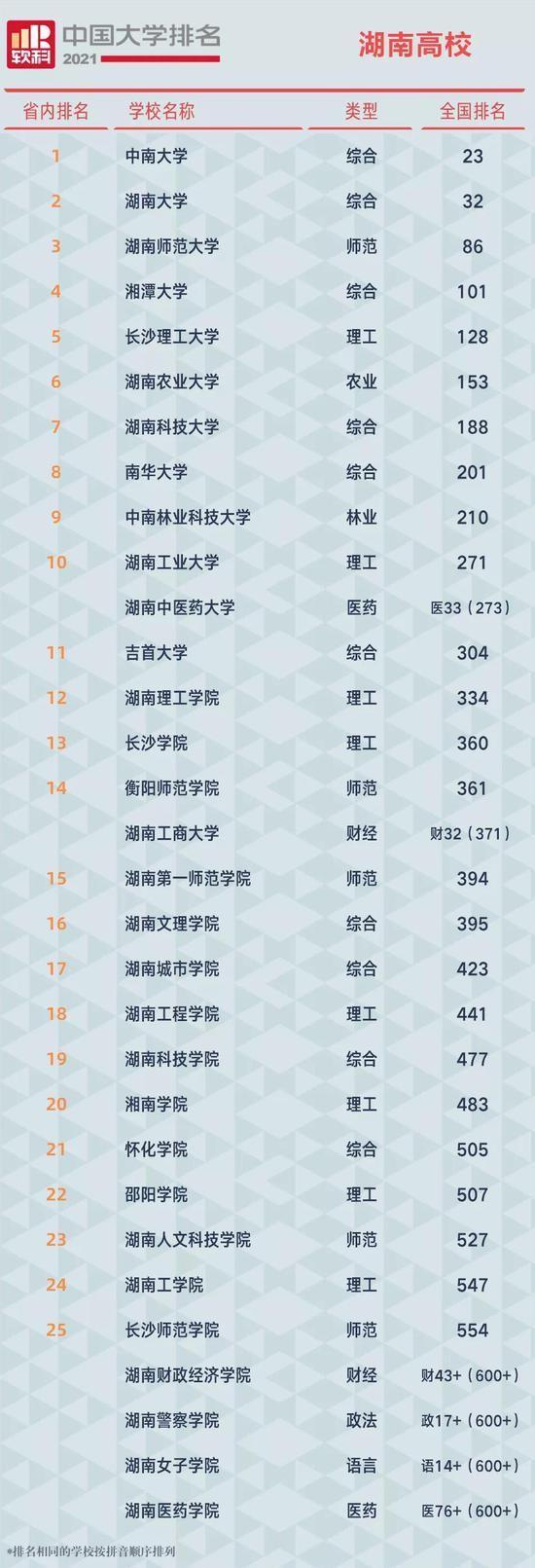 2021软科中国大学排名中,湖南共有31所高校上榜,其中中南大学居于湖南各大高校榜首,位列全国23位;湖南大学位居其后,位列全国32位,湖南师范大学则位列省内第三,全国第86位;湘潭大学位居省内第四,全国第101位,这个排名和校友会版排名基本一致,这也反映出湖南高等院校的阵型还是非常稳定的。