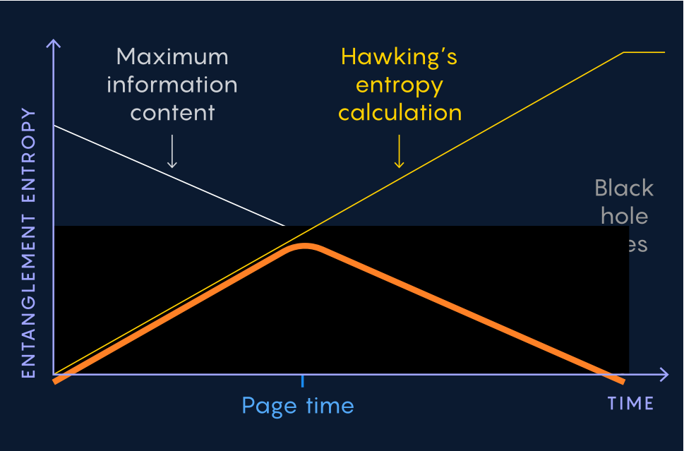 霍金的学生唐·佩奇猜测,黑洞蒸发过程应该一直被信息守恒律所制约。霍金的计算结果只反映黑洞辐射早期阶段的熵变情况,而在后期阶段,信息会以某种方式从黑洞中跑出来,并在最终黑洞蒸发殆尽的时候,从总体上保证宇宙信息守恒。从第一阶段向第二阶段转变的时间点就被称为“佩奇时间”,这条先升后降的曲线就是“佩奇曲线”。