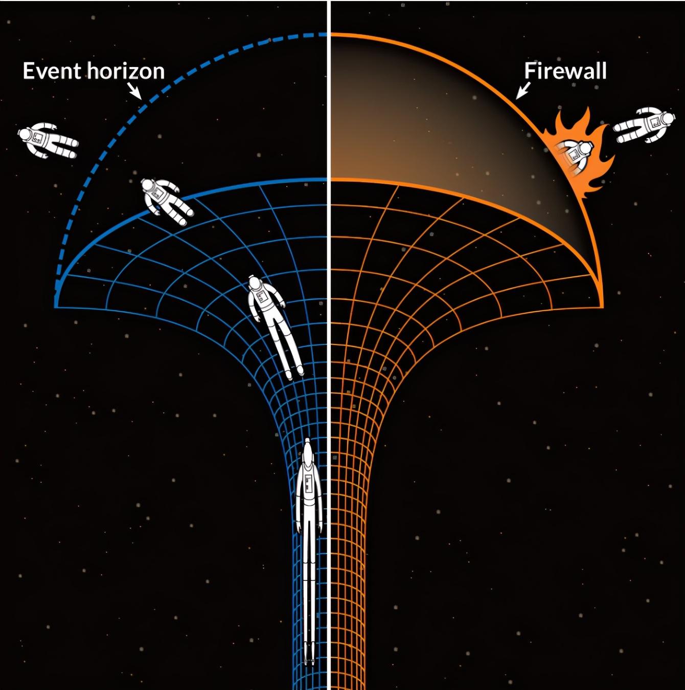 所有第一眼看到火墙理论的人,都会立即感觉这明显违背了相对性原理。物理学明明告诉我们,对自由落向黑洞的观者来说,视界处的时空依然是连续且平坦的,如果观者的尺寸小到足以抵御潮汐力,就完全可以一路吃着火锅唱着歌平安穿过视界。通往黑洞的道路又不是过南天门上天宫,怎么会无厘头地凭空出现火墙呢?