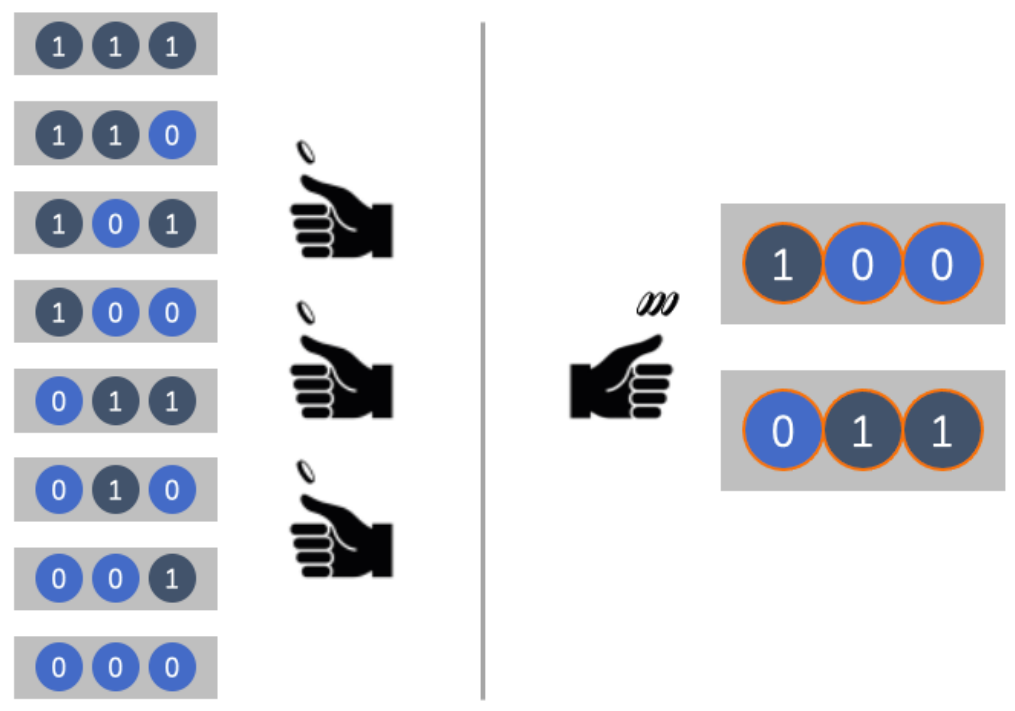 让我们设想一个简单的游戏,在桌上抛三枚硬币并记录结果,正面记为“1”反面记为“0”。如果硬币之间相互独立,那么抛掷结果是一个3位二进制数字,可能的情况一共有8种,所以这个系统的熵是ln8。而如果用胶水把硬币粘连起来,正反面分别是1和0,可能的结果就只剩下2种,这时系统的熵是ln2。而这块粘成坨的“硬币饼”就可以当做暗号标记,用来记录和传递信息,其所承载的信息量就被定义为ln8-ln2。