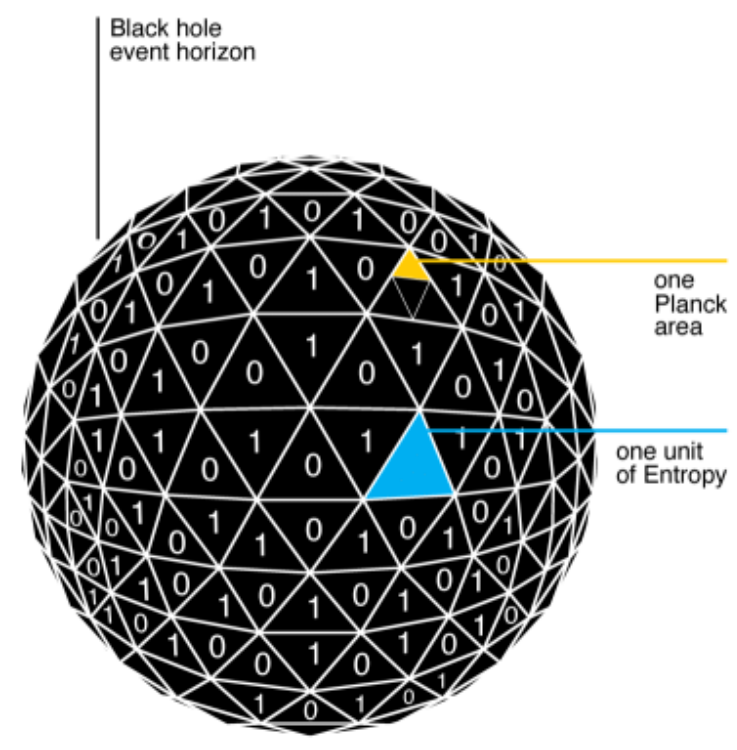 物理学家们很早就知道,黑洞的热力学熵与黑洞视界的表面积成正比,而且比例系数刚好是普朗克面积的4倍。这启示他们猜测,黑洞的粗粒化熵应该与热力学熵差不多,也与面积成正比。而粗粒化熵又只对应着自由度的个数,所以每个4倍普朗克面积的“熵单元”,就对应着一个黑洞的自由度。这样,整个黑洞就可以被看做一个有限自由度的量子系统,其自由度数就等于“熵单元”的个数。