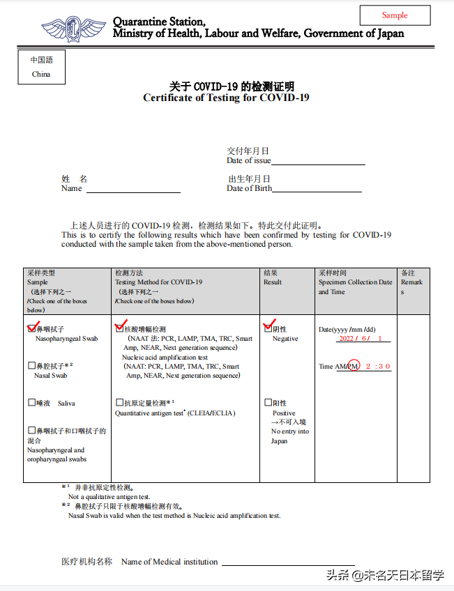 如果遇到有的医院不给填写上述指定报告,也可以由该医疗机构出具检测证明。但是一定要包含上述模板中的内容和信息,另外需要自己填写一份“检查申报书”。注意信息要保持一致,不要填错。