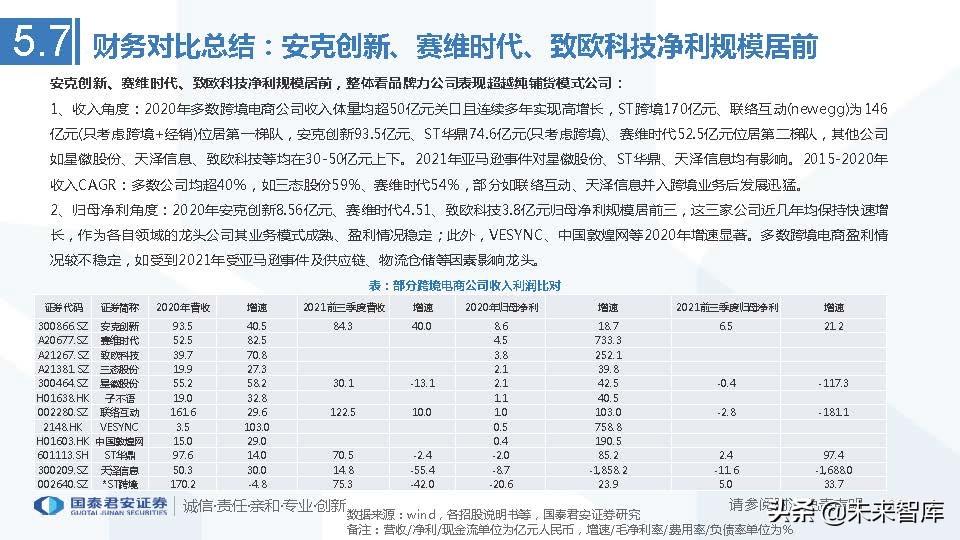 2020年安克创新、赛维时代、致欧科技归母净利规模居前三,2021年受亚马逊事件及供应链、物流仓储等因素影响部分公司表现一般。 各跨境电商盈利情况表现不一,中国敦煌网多年在盈亏线附近挣扎,2020年仅取得600多万元利润,反映出B端电商的盈利难题;联络互 动、天泽信息亦有明显波动。龙头公司因业务模式成熟因此表现较好,如安克创新2020年取得8.56亿元净利、赛维时代4.51亿元、致欧 科技3.8亿元位居前三。2021年亚马逊事件导致天泽信息在前三季度取得较大幅度亏损,此外星徽股份亦录得亏损。 2015-2020年净利CAGR:龙头公司增速迅猛,如赛维时代88%、三态股份51%、安克创新45%,ST跨境在2017年之前增长迅速。