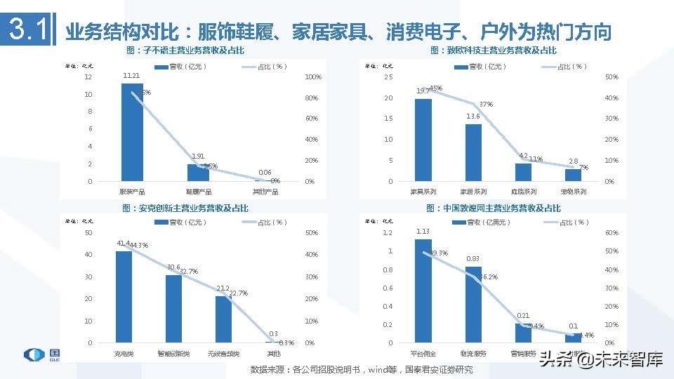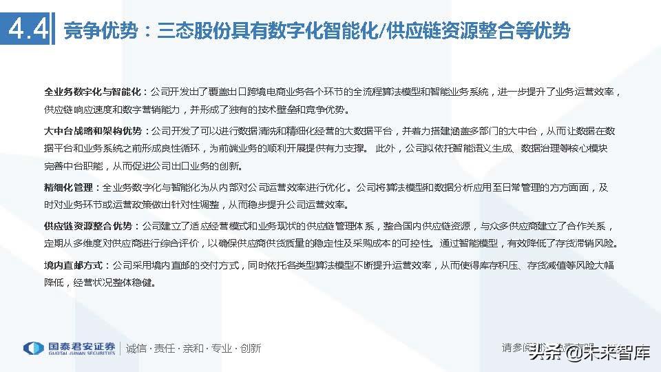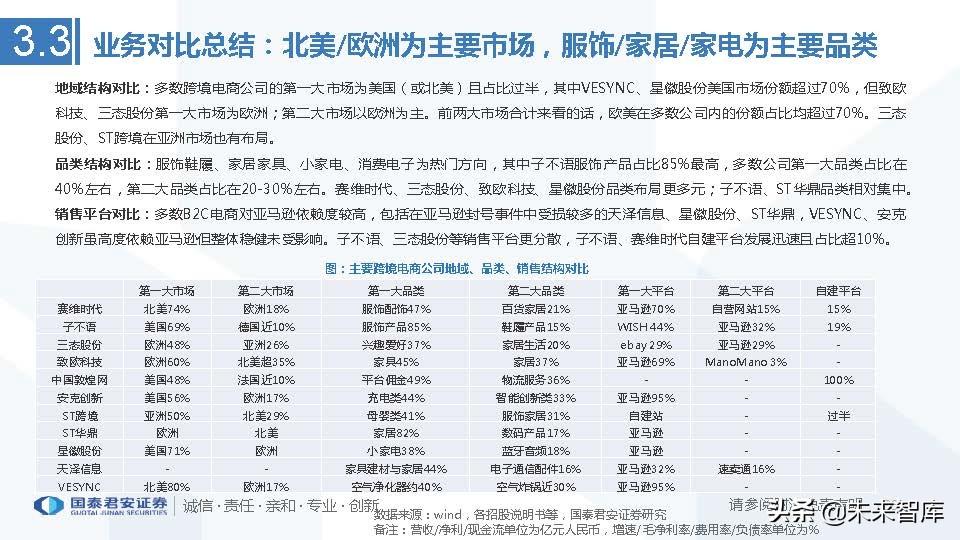 从历史时间序列看:子不语毛利率保持提升,因并定位消费能力较强的中高端客户,且自营网站业务收入占比不断扩大;致欧科技毛利 率下降因2B收入占比提升但仍高于其他家居企业毛利率;三态股份毛利率下降因物流业务占比提升,其电商业务毛利率与赛维时代一样 保持稳定;VESYNC毛利率提升因高毛利产品如空气炸锅等占比提升。(报告来源:未来智库)