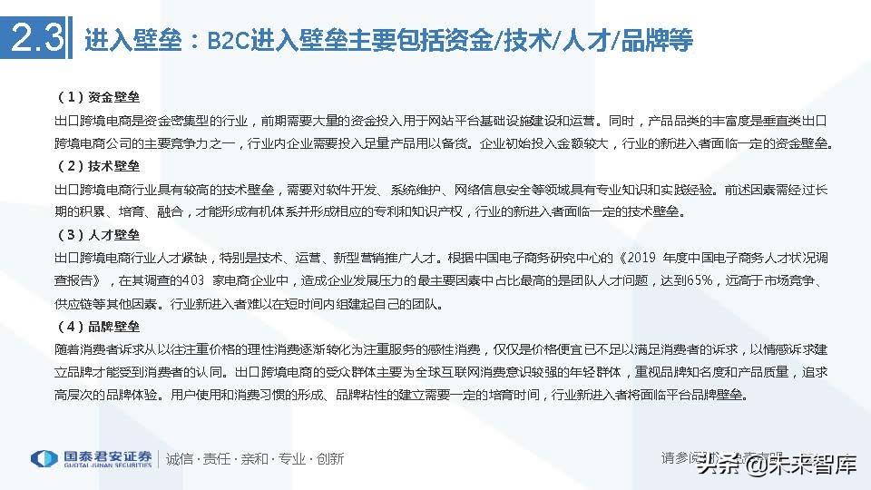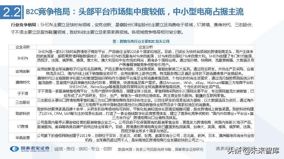 行业竞争格局:我国B2B跨境电商市场目前正处于快速发展期,市场准入门槛相对较低,行业整体呈现出企业数量多、竞争格局分散的 特点。其中阿里巴巴国际站、中国敦煌网、中国制造网是主要龙头企业,据阿里国际站总经理,近三年来GMV年增长率均超100%(预 计400亿美元左右含Lazada)。2020年起小商品城通过打造chiangoods平台正在快速切入这一市场,预计2023年GMV超500亿元。(报告来源:未来智库)