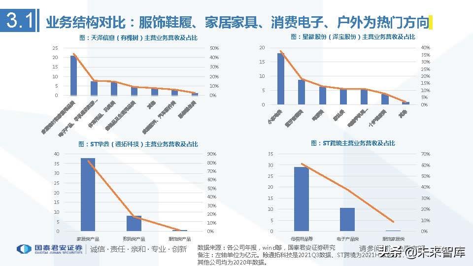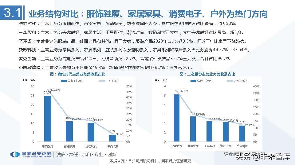 赛维时代:主营业务为服饰配饰、百货家居、运动娱乐,数码按摩四大类,其中服饰配饰收入占比最高,约为50%。