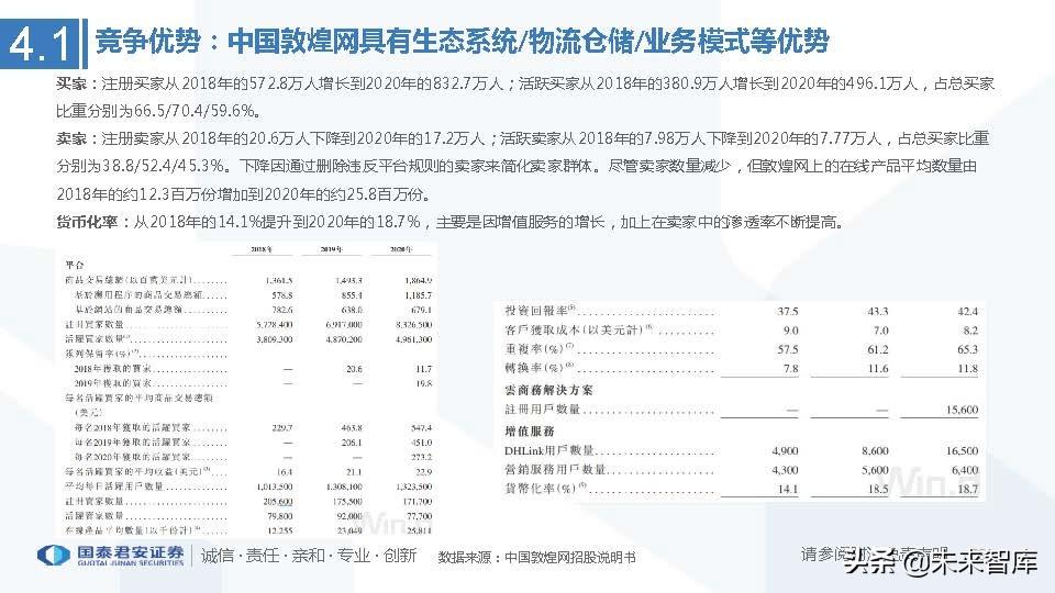 中国敦煌网:主要收入来源为平台佣金49.3%、增值服务中的物流服务36.2%(发展迅速)。