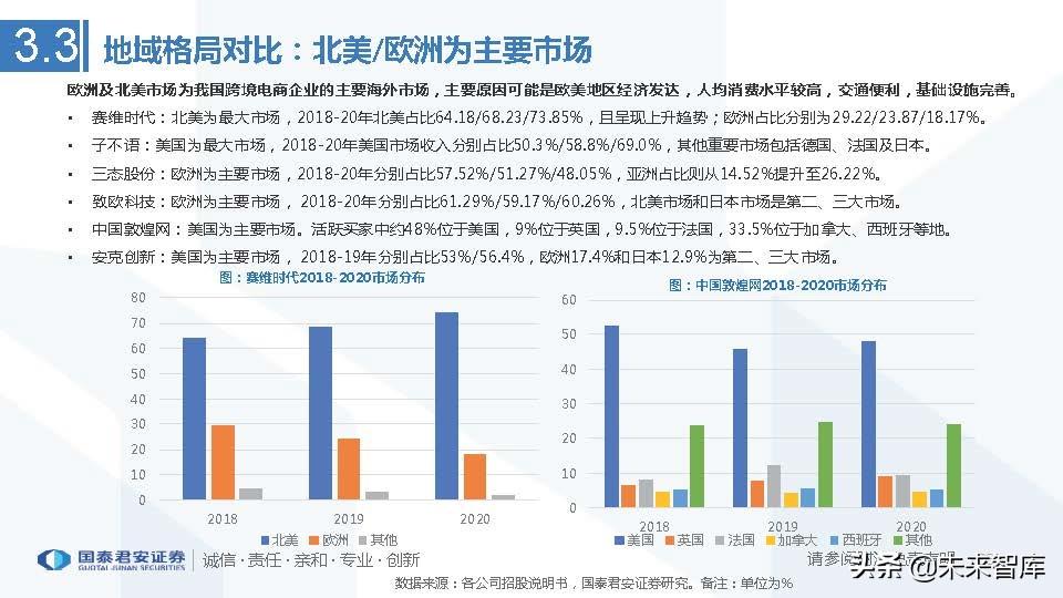 赛维时代:北美为最大市场,2018-20年北美占比64.18/68.23/73.85%,且呈现上升趋势;欧洲占比分别为29.22/23.87/18.17%。