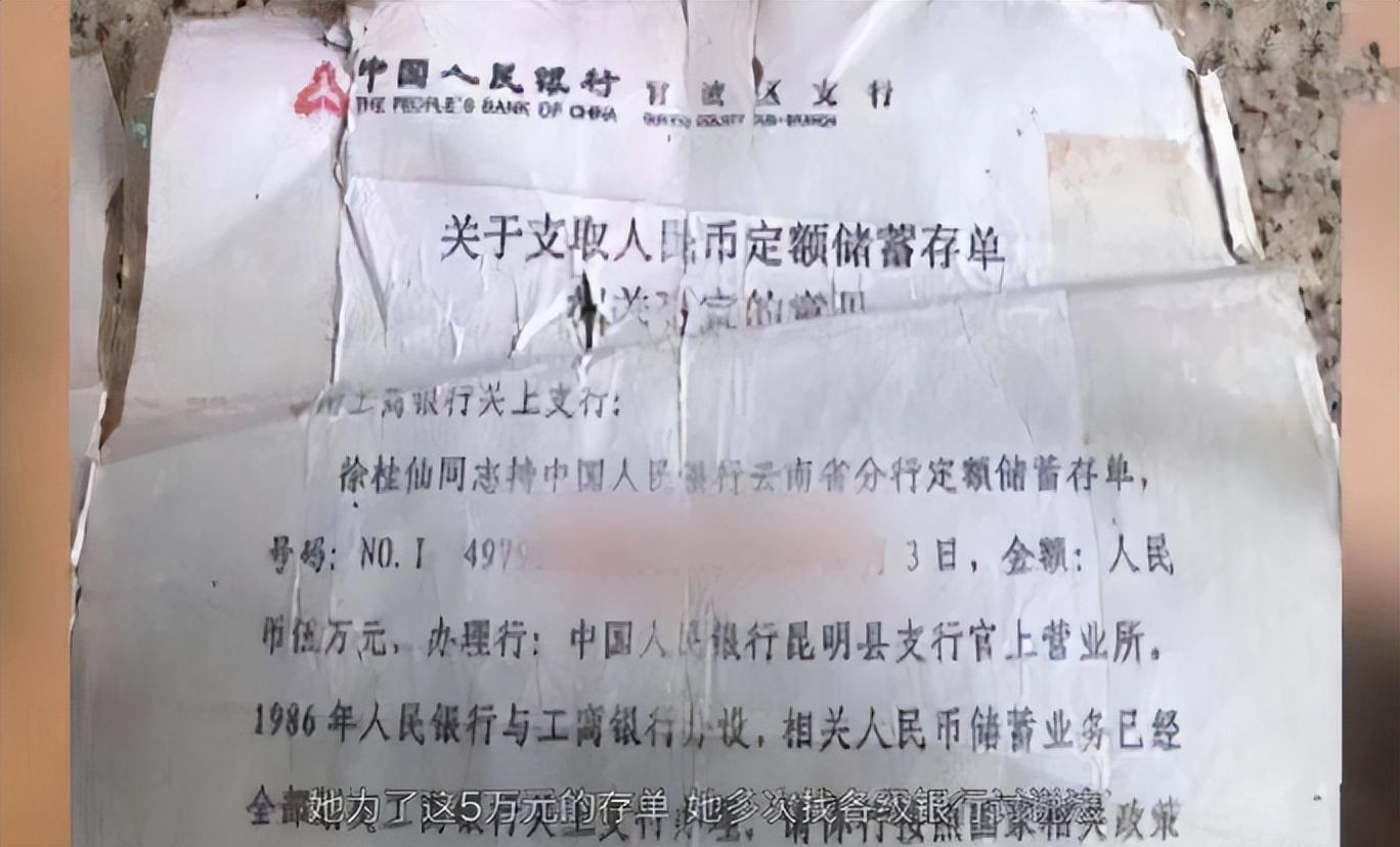 2001年,一个老太太微微颤颤地来到中国银行。老太太姓徐,已经七十多岁了。老年人来银行一般都不会操作,她直接来到了人工柜台前说到“小姑娘,我要取钱”。说着,徐老太就从口袋里掏出了一个手绢,将手绢打开,里面包着一张看上去年份不小的单据,“这是我当时存钱的单子。”工作人员接过来一看,单据上有中国人民银行定额存单的字样,下面也盖有人民银行的印章,但让人吃惊的是,这张单据的存款日期上赫然写着1953年。