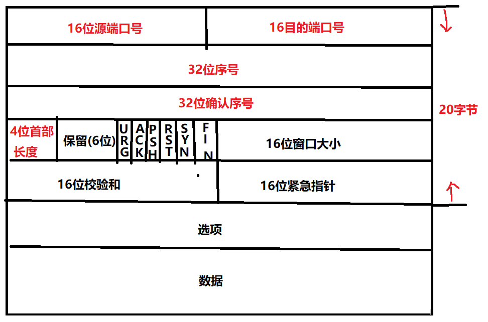 URG: 紧急指针是否有效ACK: 确认号是否有效PSH: 提示接收端应用程序立刻从TCP缓冲区把数据读走RST: 对方要求重新建立连接; 我们把携带RST标识的称为复位报文段SYN: 请求建立连接; 我们把携带SYN标识的称为同步报文段FIN: 通知对方, 本端要关闭了, 我们称携带FIN标识的为结束报文段16位窗口大小(先留个疑,其实就是存储接收缓冲区还剩下的大小, 和流量控制有关)