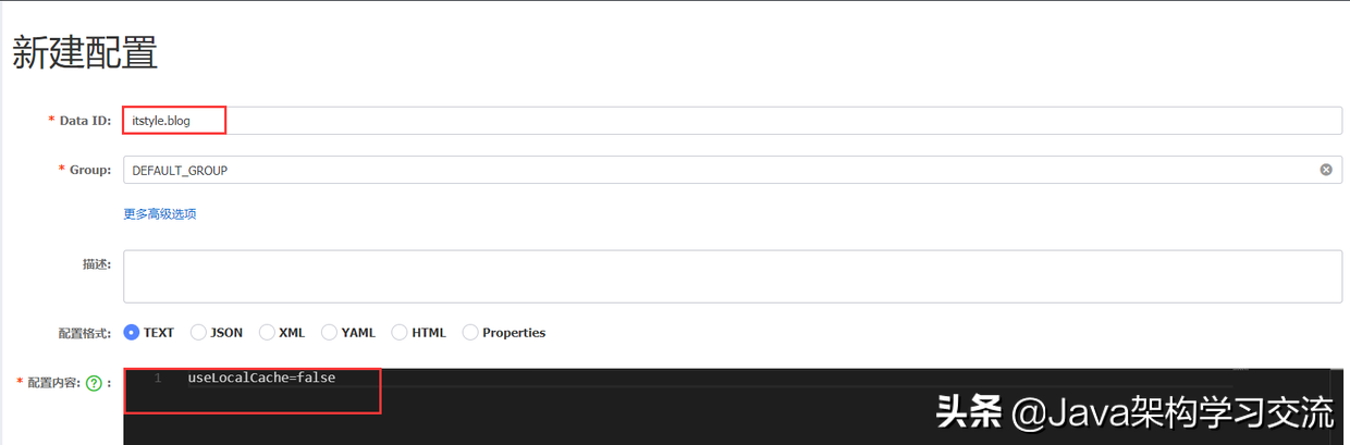 dataId 一定要与系统配置保持一致,配置内容为键值对的方式。