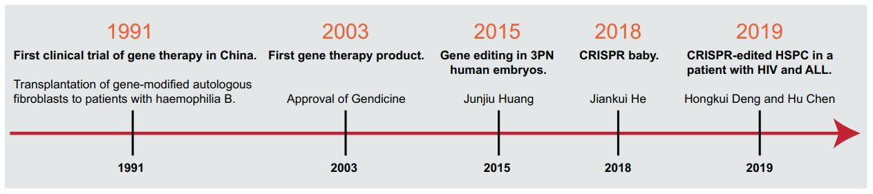 尽管基因疗法最初于国外被开发并展开研究,但从上图中不难发现,世界上首个基因治疗产品其实出现在中国。在基因疗法发展的历史长河上,中国早在1991年就对B型血友病患者展开了世界上第二次的基因治疗临床试验,并于2003年批准获得了世界上第一个基因治疗产品今又生(Gendicine)。随后在约20年的时间里,中国在基因疗法领域方面做出了不断的努力。