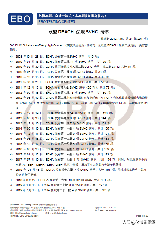 最新版欧洲REACH标准已经更新到了201项了,REACH检测按照不同的材质其需要检测的项目分为金属测试项目和非金属测试项目。对于金属产品,REACH检测项目为REACH 71项;对于非金属材质,REACH检测项目是201项。