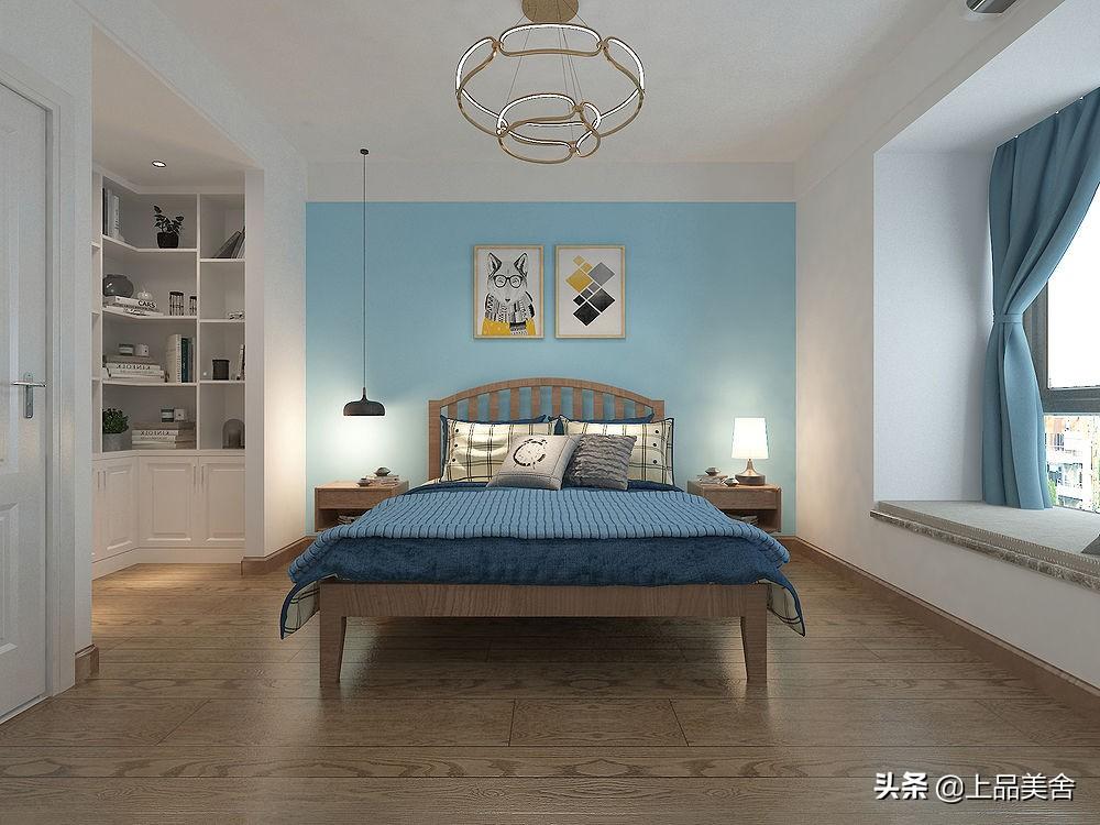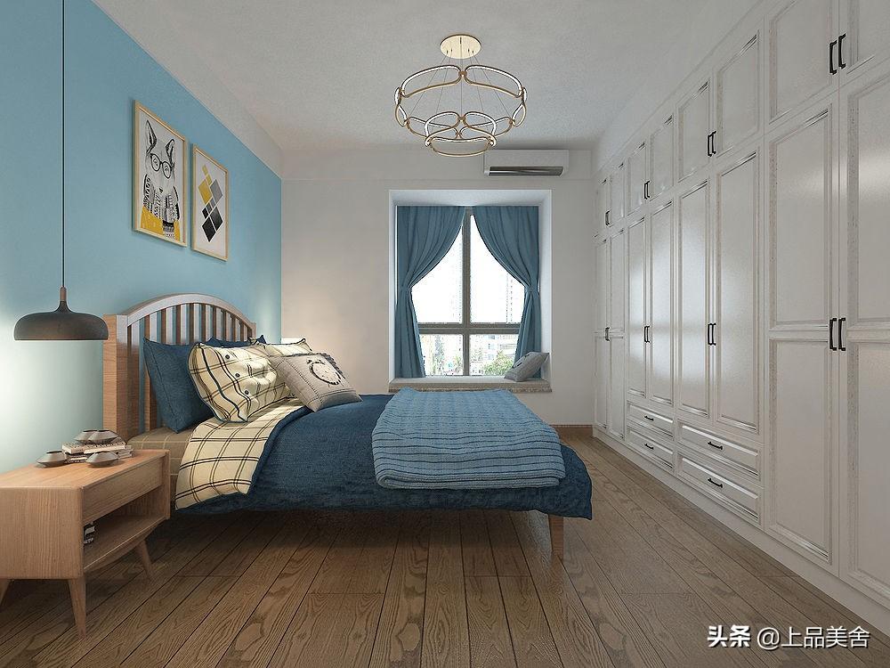 主卧简洁大方,与整体空间风格一致,也采用北欧风简约的设计,在床对面设计了一整排白色衣柜与床头浅蓝色背景墙交相辉映;主卧空间整体除了飘窗比较小之外,床尾的一整面衣柜还是很大气,衣柜做了一排抽屉还是比较实用,可以放袜子之类的物品,抽屉建议做150mm深。