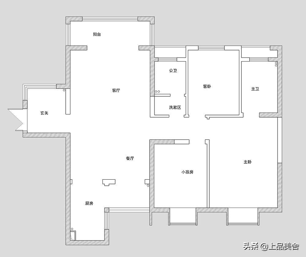 本案是毛坯房设计,整体户型布局合理,有独立玄关,采光充足,厨房有点小,两个卧室面积不大,户型比较紧凑。房子的得房率还是很高的,从业主口中得知这个房子的买房面积和实际124平米相差不大。