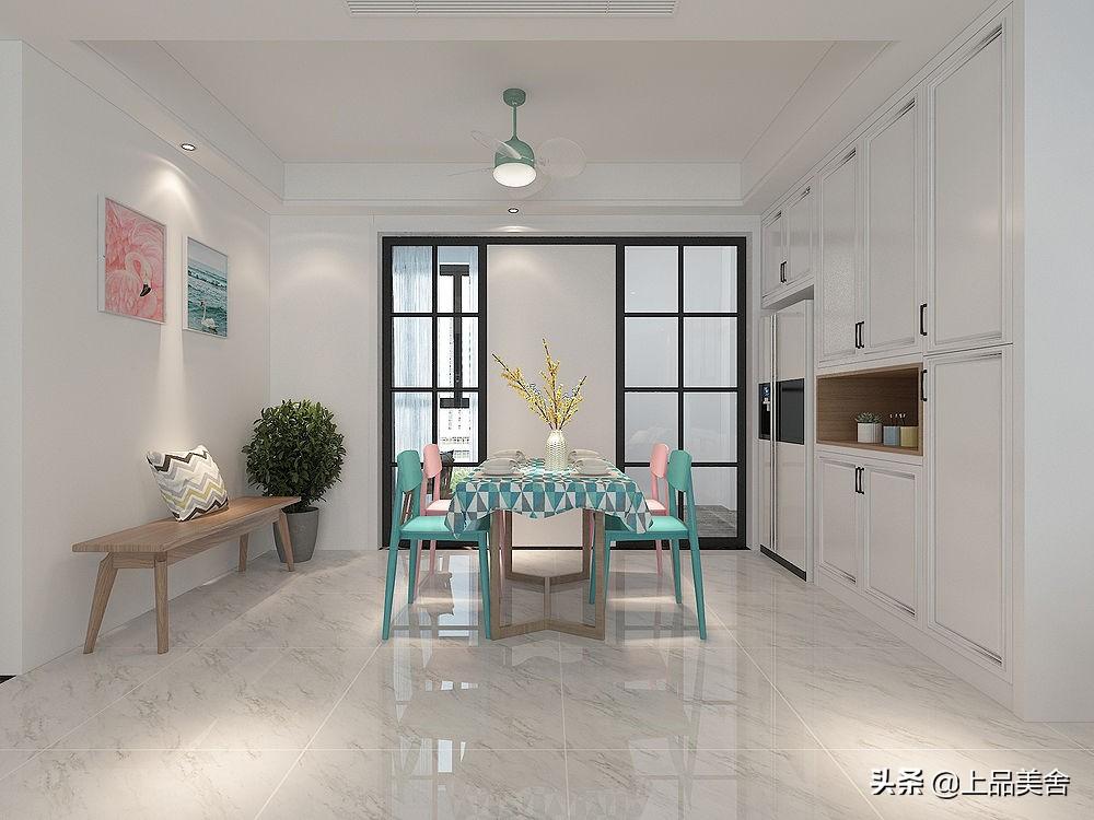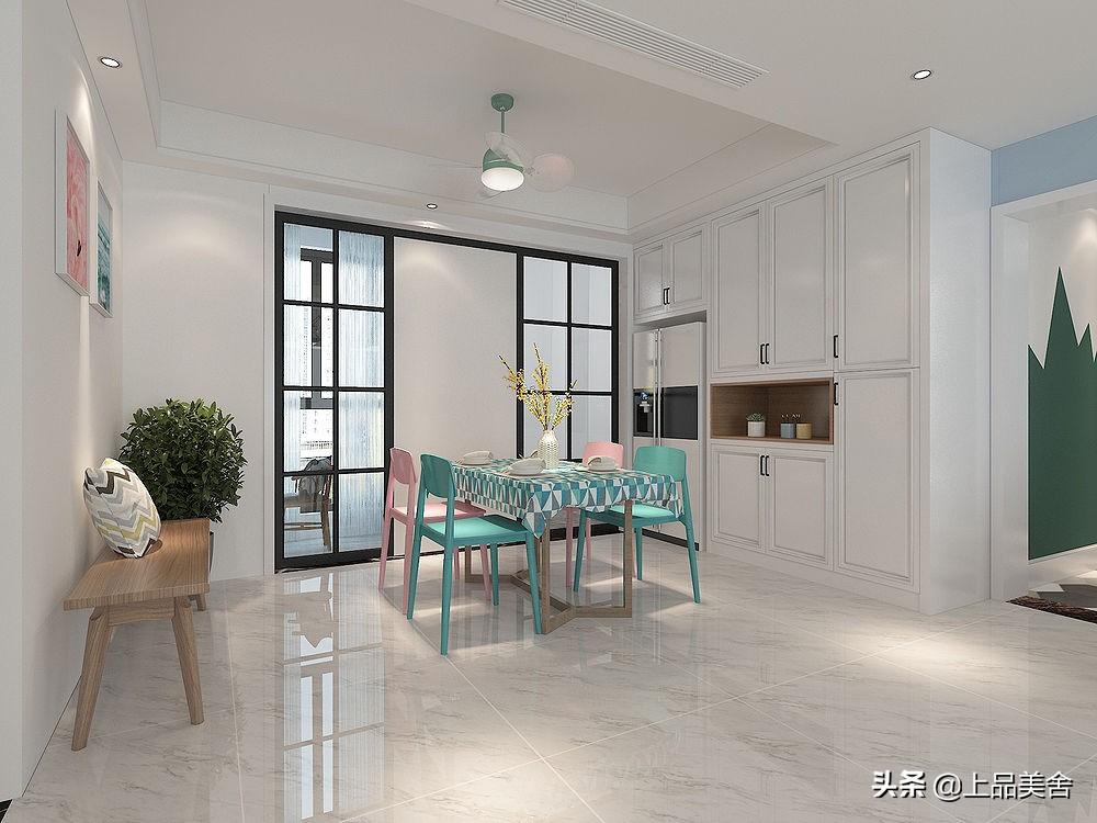 餐厅做了一整排柜子美观又实用,满足了餐厅的储物收纳功能,同时又补缺了厨房的面积不够,放冰箱后比较拥挤的问题;餐厅空间里面的两扇玻璃推拉门,分别是进书房和厨房的。旁边放了一张等待用餐椅,开饭前坐在这里等候,让用餐变得更加有仪式感。