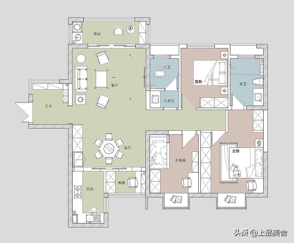 通过与业主的沟通后做出以下改造:在主卧加建隔墙,把厨房通往生活阳台的门洞封平为阳台增加使用面积,将生活阳台改为书房使用,将厨房门和书房门设计为移门的方式,即美观又实用。