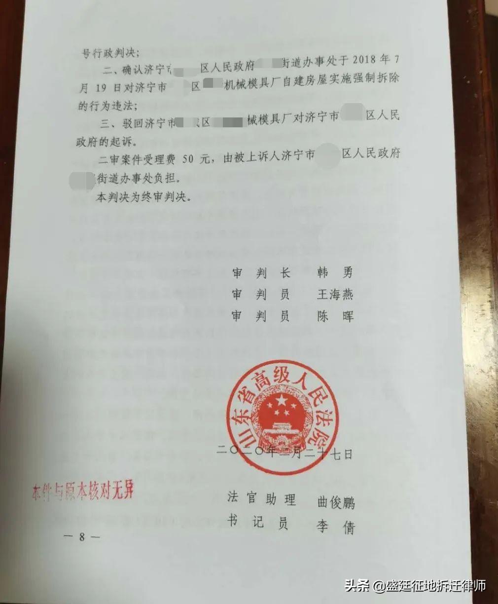 终于在律师的据理力争下,山东高院判决街道办强拆违法,而这次的结果,也成了后续获得赔偿的关键。
