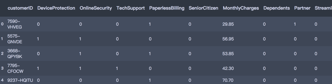 对于二分类变量,编码为0和1;对于多分类变量,进行one_hot编码;对于数值型变量,部分模型如KNN、神经网络、Logistic需要进行标准化处理。# 筛选变量select_features = x_sel.columns# 建模数据df_model = pd.concat([df['customerID'], df[select_features], df['Churn']], axis=1)Id_col = ['customerID']target_col = ['Churn']# 分类型cat_cols = df_model.nunique()[df_model.nunique() < 10].index.tolist() # 二分类属性binary_cols = df_model.nunique()[df_model.nunique() == 2].index.tolist()# 多分类属性multi_cols = [i for i in cat_cols if i not in binary_cols] # 数值型num_cols = [i for i in df_model.columns if i not in cat_cols + Id_col] # 二分类-标签编码le = LabelEncoder()for i in binary_cols:df_model[i] = le.fit_transform(df_model[i]) # 多分类-哑变量转换df_model = pd.get_dummies(data=df_model, columns=multi_cols) df_model.head()