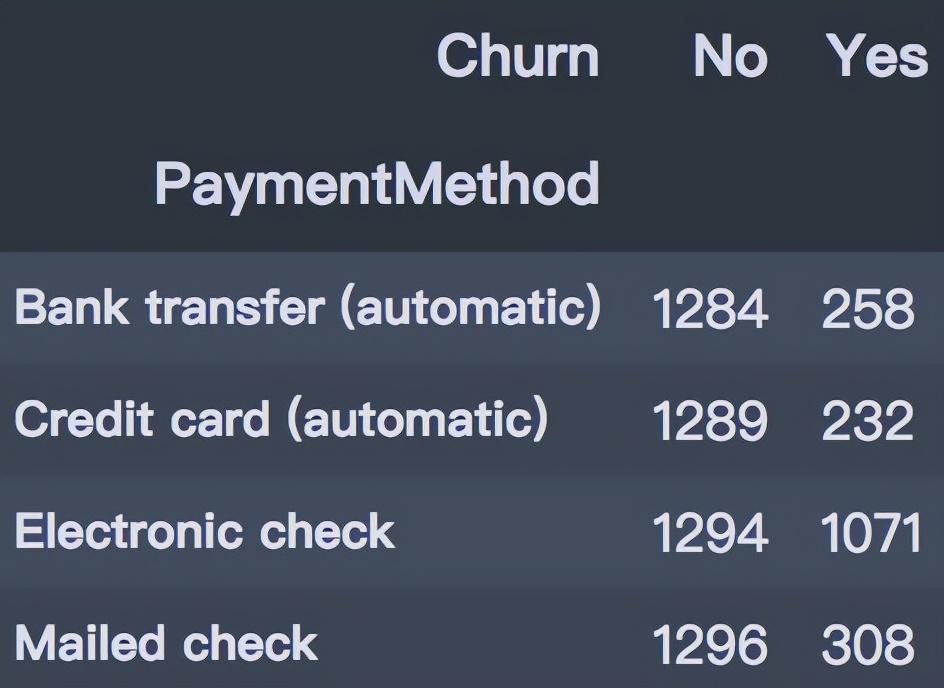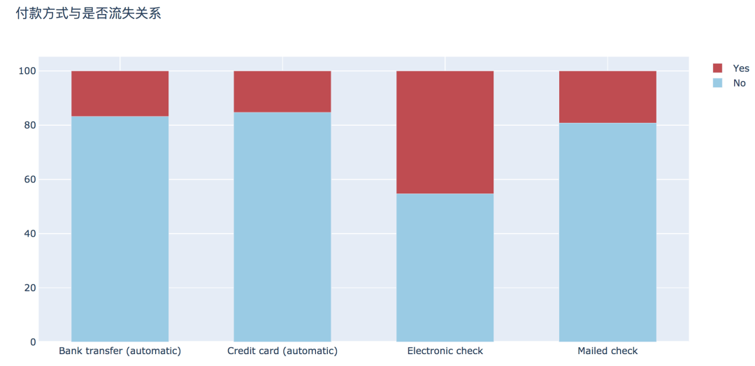 支付方式上,支付上,选择电子支票支付方式的用户流失最高,达到45.29%,其他三种支付方式的流失率相差不大。