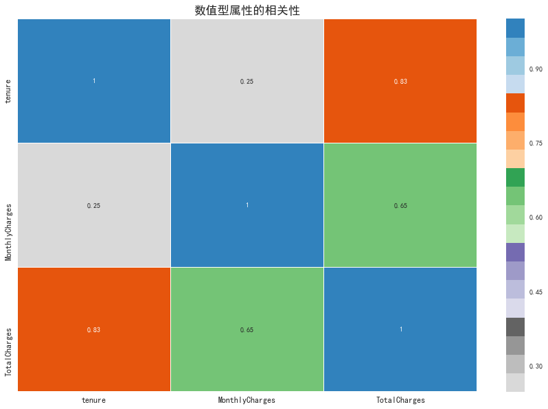 plt.figure(figsize=(15, 10)) sns.heatmap(df.corr(), linewidths=0.1, cmap='tab20c_r', annot=True)plt.title('数值型属性的相关性', fontdict={'fontsize': 'xx-large', 'fontweight':'heavy'}) plt.xticks(fontsize=12)plt.yticks(fontsize=12)plt.show()