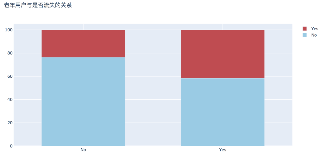 老年用户流失比例更高,为41.68%,比非老年用户高近两倍,此部分原因有待进一步探讨。